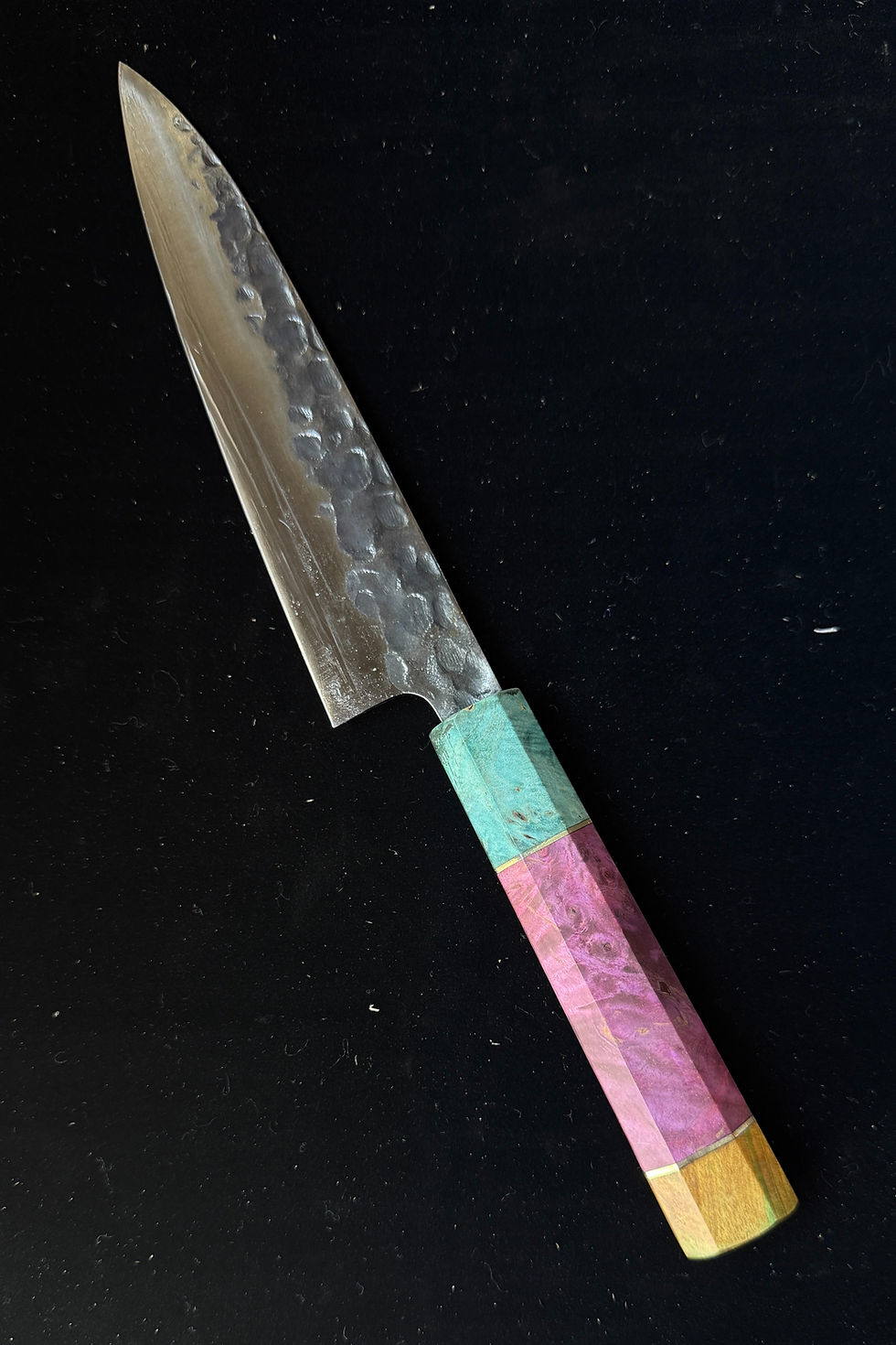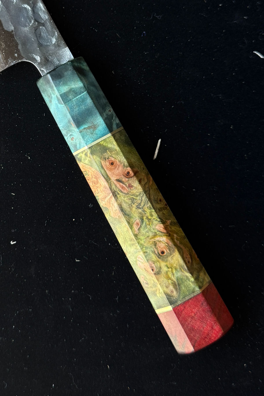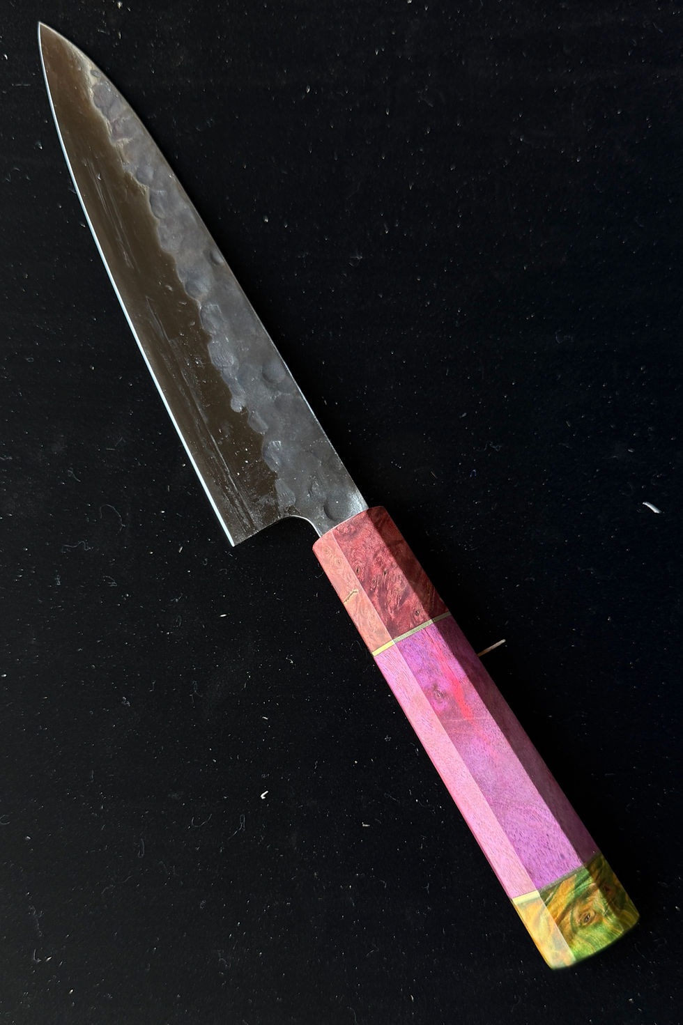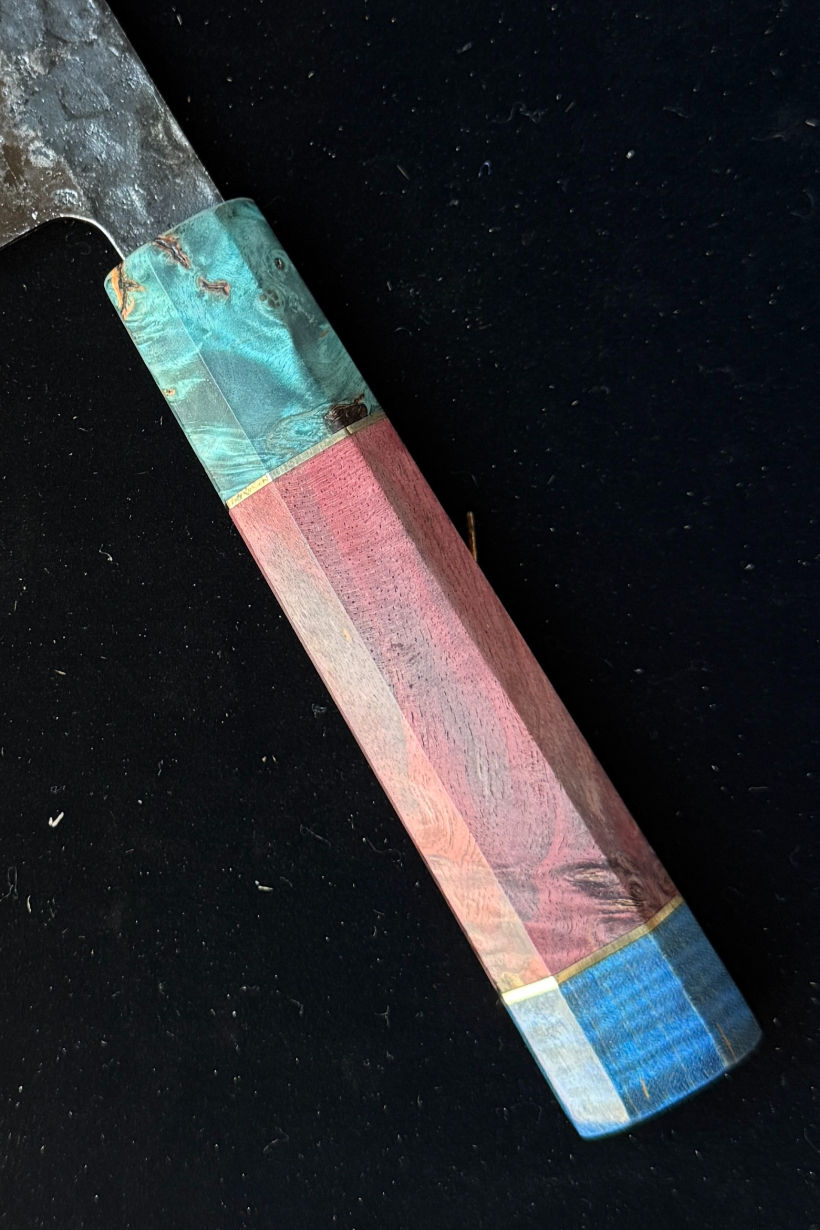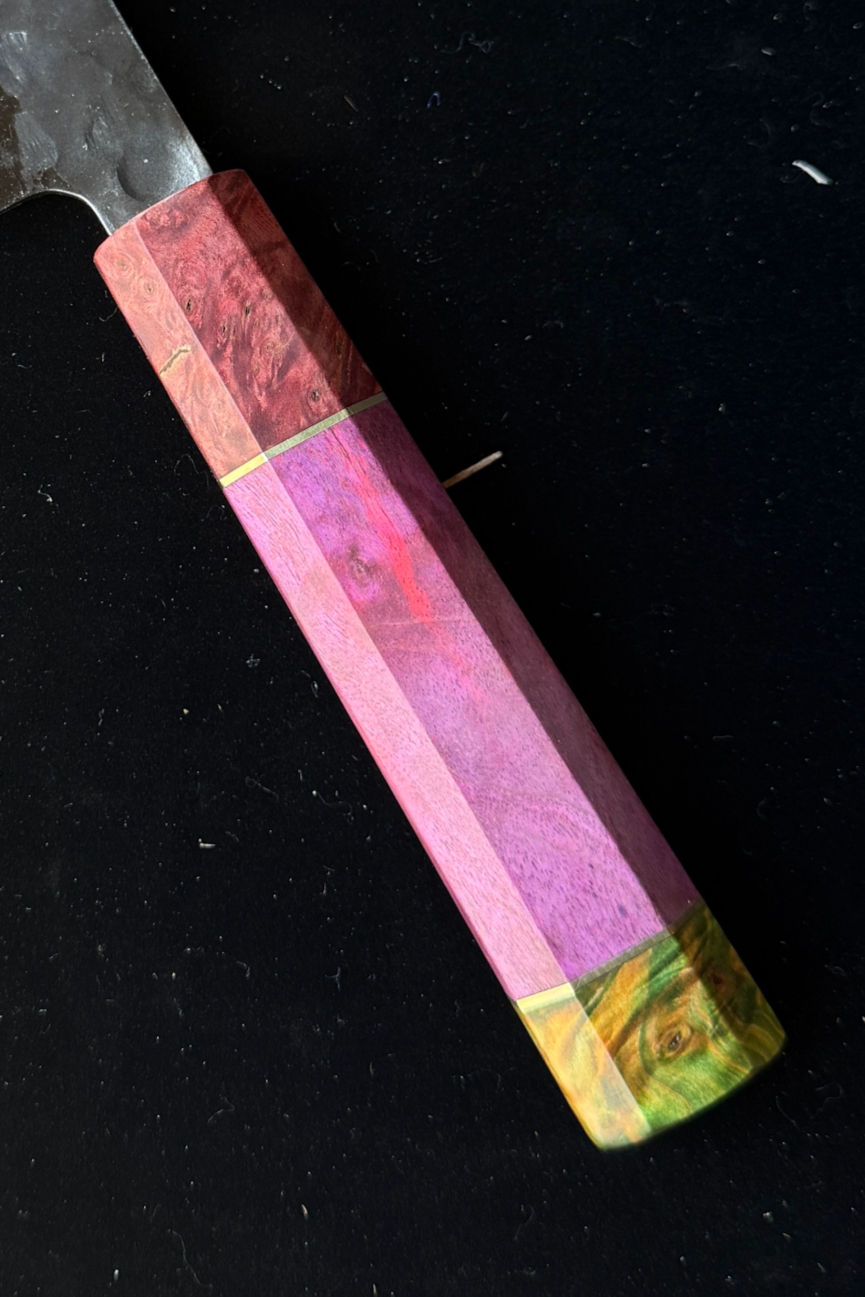These hyper-limited edition knives pushed our team to test new techniques resulting in these stunning one-of-a-kind strikingly colored stabilized burl wood and AUS10 steel knives.
